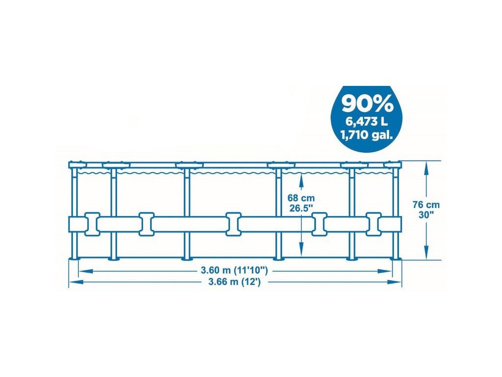 - Mimoriadne pevné bočné steny tohto bazéna sú konštruované z materiálu Tritech ™, čo je 3-vrstvový vystužený materiál s polyesterovou mriežkou uloženou medzi dvoma vrstvami vysoko odolného PVC. Celková hrúbka steny je 0,40 až 0,80 mm v závislosti na veľkosti bazénu