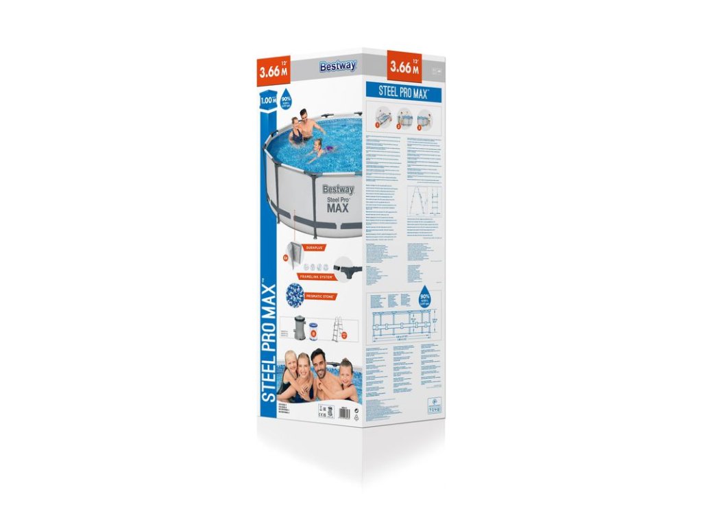 Nie je nič lepšie, ako mať svoj vlastný bazén na záhrade a užívať si leto s priateľmi a rodinou. Nadzemný bazén Bestway® Steel Pro MAX ™ ponúka variant odolný voči UV žiareniu aj chlóru za skvelú cenu. Oceľový rám rezistentný voči korózii je vybavený systémom FrameLink System ™ pre pevné a bezpečné spojenie rámu. Podšívka DuraPlus™ je vyrobená z odolného materiálu, ktorý je zosilnený kvôli pevnosti a rezistencii voči prepichnutiu.