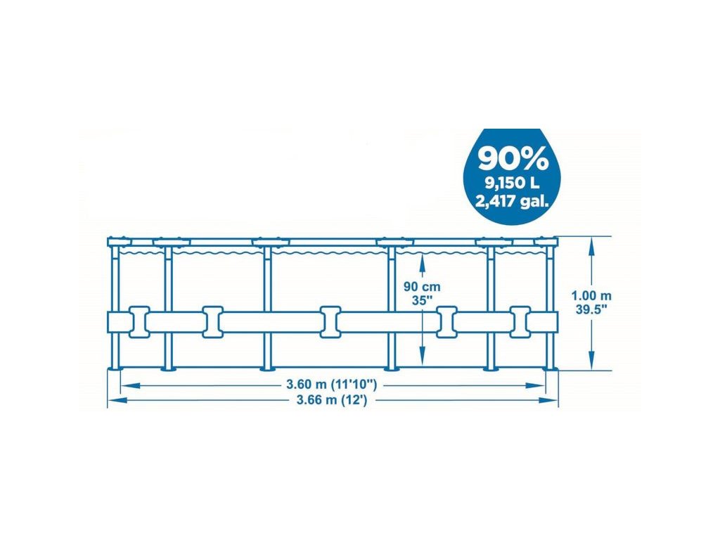 - Mimoriadne pevné bočné steny tohto bazéna sú konštruované z materiálu Tritech ™, čo je 3-vrstvový vystužený materiál s polyesterovou mriežkou uloženou medzi dvoma vrstvami vysoko odolného PVC. Celková hrúbka steny je 0,40 až 0,80 mm v závislosti na veľkosti bazénu