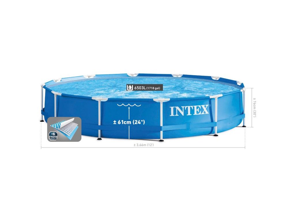 Užite si hodiny vonkajšej zábavy s bazénom Intex® Metal Frame™ 28212 s rozmermi 3,66x0,76 m. Je vyrobený z 3-vrstvového odolného materiálu SUPER-TOUGH® odolného proti prepichnutiu. Pozinkovaná konštrukcia s práškovým nástrekom zaisťuje vysokú odolnosť. Technológia Hydro Aeration® poskytuje zlepšenú cirkuláciu a filtráciu, zlepšenú čírosť vody a zvýšený počet záporných iónov na vodnej hladine. Kapacita vody je 6 503 litrov (90 %).