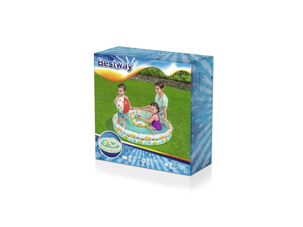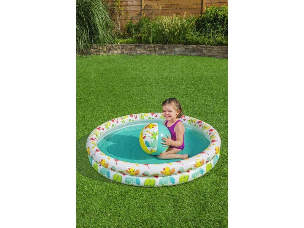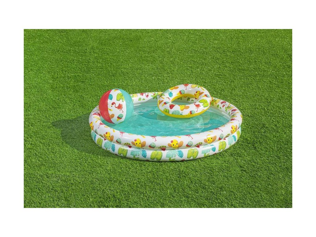 Pestrofarebný bazénik Bestway® 59460 Play Pool Set s letným motívom ľahko vytiahne deti z domu vonku na slniečko. Jeho kvalita a odolnosť je vopred testovaná, tak aby vydržal rôzne detské hry vo vode. Tento nafukovací bazénik je perfektným miestom pre všetky deti staršie ako 2 roky, ktoré sa chcú hrať vo vode počas letných horúčav. V balení nájdete aj nafukovaciu loptu a plávací kruh v rovnakom dizajne ako bazénik. Rozmery: 1,22x0,20 m.