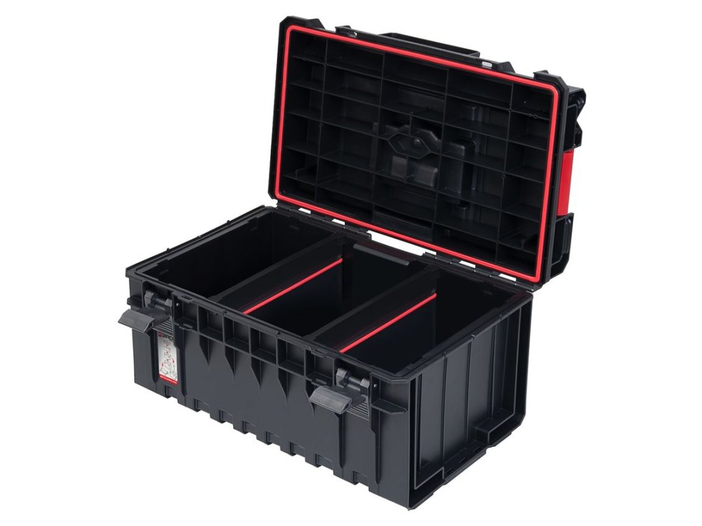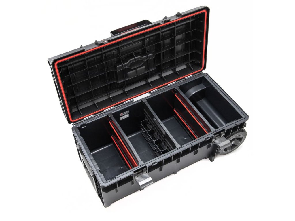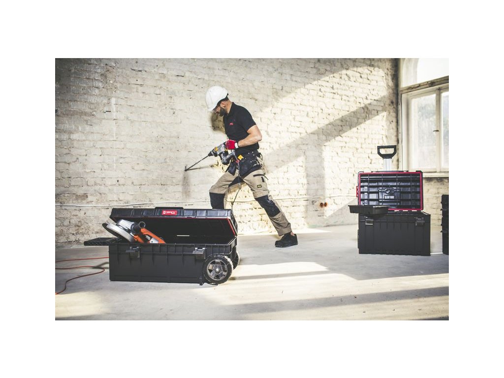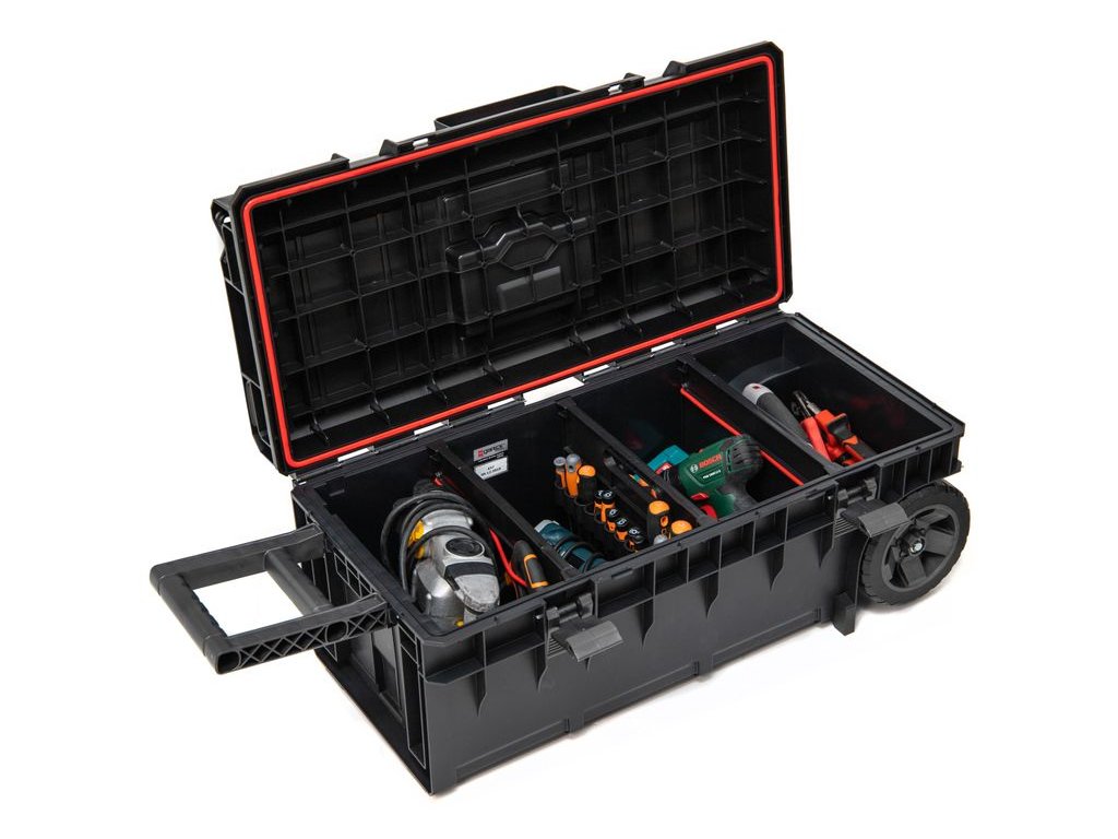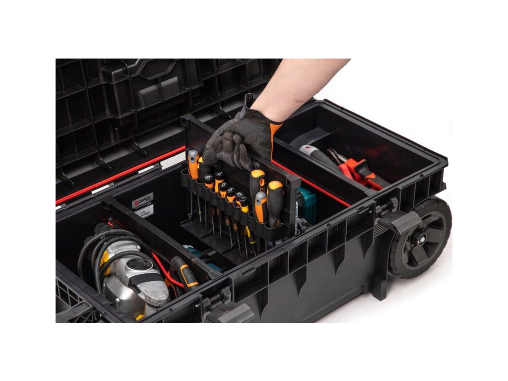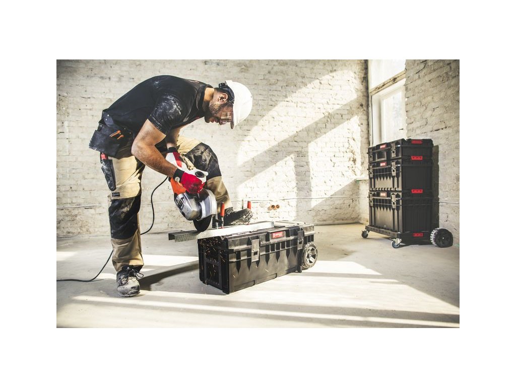 Mobilný box na náradie vám umožňuje prenášať dlhé nástroje ako kladivá, uhlové brúsky alebo miešačky na cementovanie spolu s potrebným príslušenstvom. Je vybavená tromi nastaviteľnými priehradkami - dve s elastickými popruhmi a jedna Multi priehradka, vďaka čomu je ľahké udržiavať poriadok vo vnútri boxu vďaka rôznym držiakom na ručné náradie. Odnímateľnú multi prepážku možno použiť ako samostatný nosič náradia. Nadštandardné rozmery z neho robia jedinečný produkt vo svojej kategórii.
