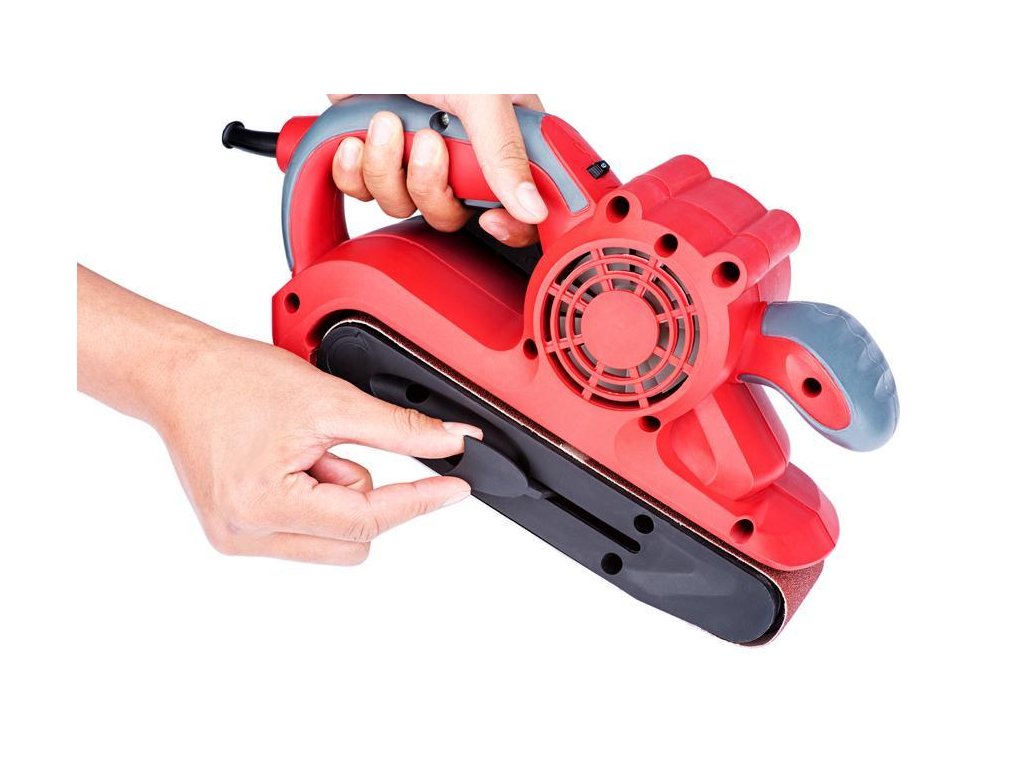 Hlavnú úlohu pri brúsení zohráva okrem motora, brúsiaci pás. Jeho rozmery sú 76 x 533 mm. Pás jednoducho priložíte na potrebný materiál a brúsite. Po opotrebovaní brúsneho papiera je potreba vymeniť ho za vhodný typ. Vďaka jednoduchému mechanizmu nebudete mať problém s rýchlou výmenou brúsneho pásu. Oceníte tiež praktický gombík, ktorý slúži na vycentrovanie brúsneho pásu.