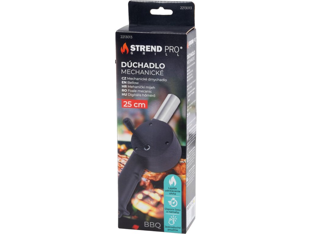 Dúchadlo Strend Pro Grill je praktická pomôcka na rýchle a jednoduché rozžeravenie uhlíkov pri grilovaní. Vďaka mechanickému pohonu pomocou kľuky môžete ľahko regulovať prúd vzduchu bez potreby batérií či elektriny.