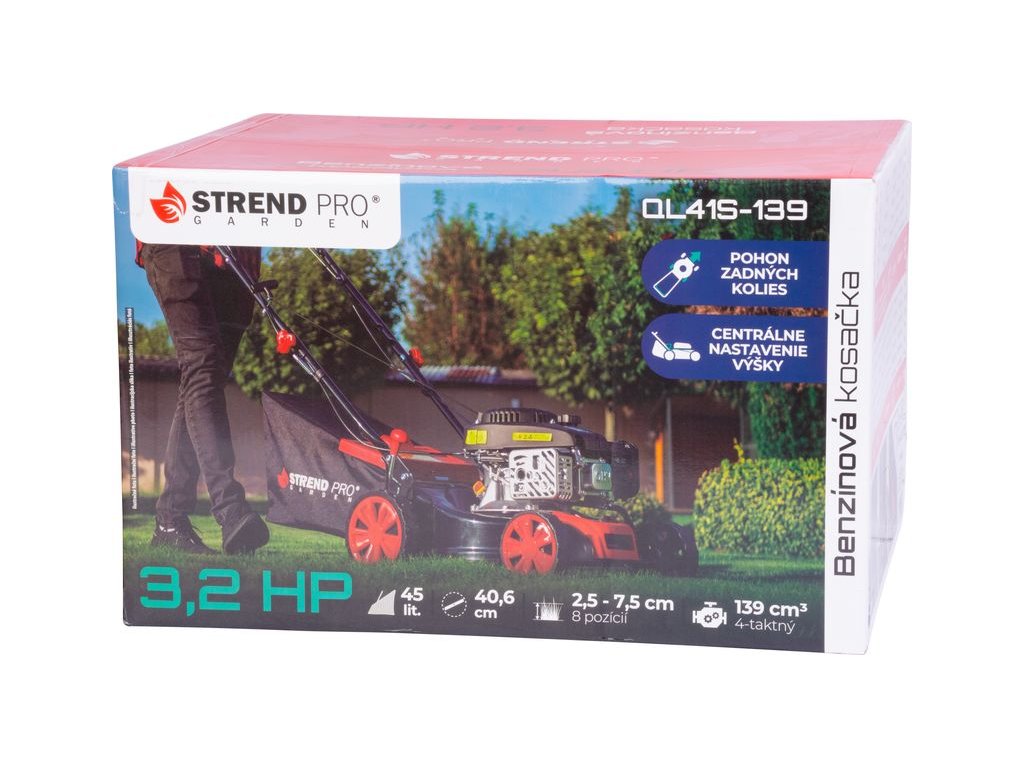 Benzínová záhradná kosačka Strend Pro QL41S-139 určená na kosenie trávy je nevyhnutnou súčasťou každej záhrady. Kosačka je vybavená motorom LC1P65FE-4 s obsahom 139 cm3 s menovitým výkonom 2,4 kW. Kosačka umožňuje vybrať si z 8 pozícií výšky kosenia v rozsahu 25 - 75 mm. Šírka záberu pri kosení dosahuje 40 cm. Je tiež vybavená praktickým zberným košom s objemom 45 litrov. Kosačka pracuje rýchlosťou až 3600 otáčok/min.