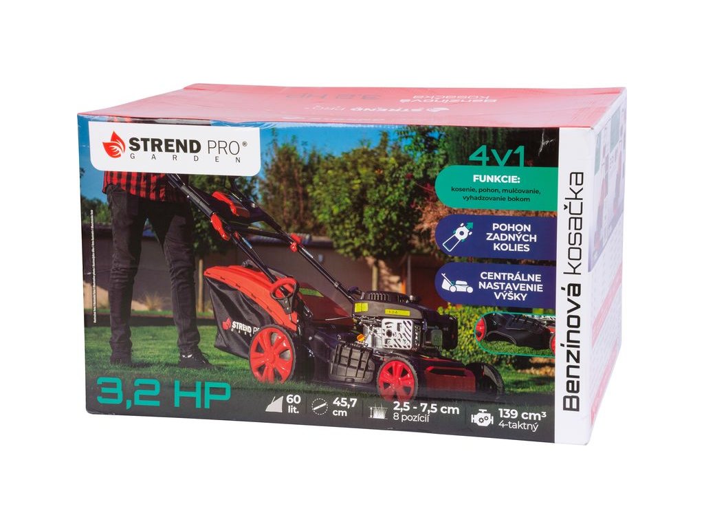 Benzínová záhradná kosačka Strend Pro QL46P-139 s pojazdom určená na kosenie trávy je nevyhnutnou súčasťou každej záhrady. Kosačka je vybavená 4-taktným vzduchom chladeným motorom LONCIN s obsahom 139 cm3 s menovitým výkonom 2,4 kW (3,2 HP). Praktickým doplnkom je odkladací priestor na rukoväti na mobil a nápoj. Kosačka umožňuje vybrať si z 8 pozícií výšky kosenia v rozsahu 25 - 75 mm. Šírka záberu pri kosení dosahuje skvelých 45,7 cm. Je tiež vybavená praktickým zberným košom s objemom 60 litrov s ukazovateľom stavu naplnenia. Kosačka pracuje rýchlosťou až 3600 otáčok/min. Stabilný a pevný oceľový skelet je opatrený otvorom pre bočné vyhadzovanie. Vďaka tomu je možné kosiť i ľahko prerastenú trávu, a bez toho, aby sa kosačka hltila a obsluha šliapala v pokosenej tráve. S mulčovacou záslepkou trávu pokosíte na malé kúsky, ktoré následne v tráve plnia funkciu hnojenia. Ručné štartovanie. Motor je vybavený sytičom pre studený štart. Kosačka disponuje sklopnou rukoväťou, takže výrazne šetrí priestor pri uskladnení. Jednoduchá obsluha.