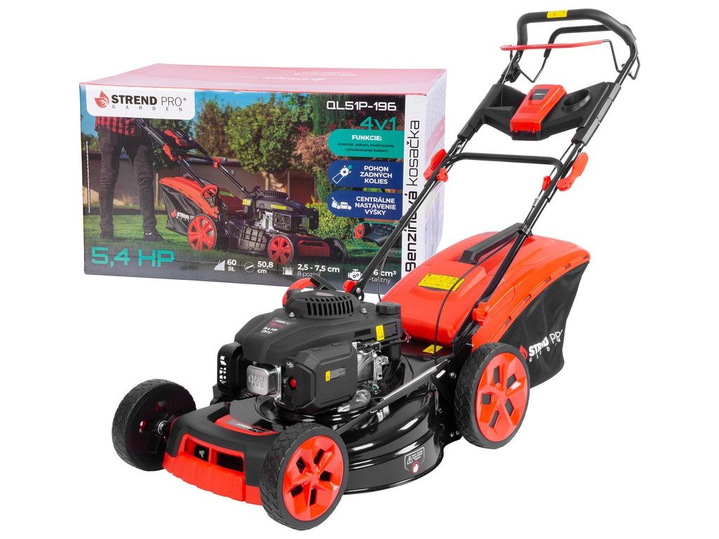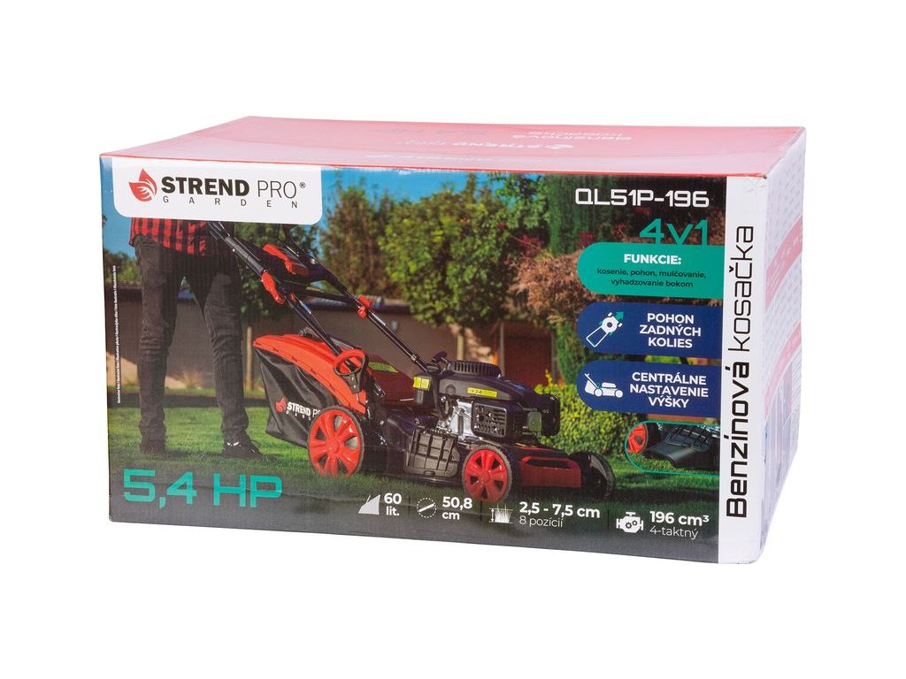 Benzínová záhradná kosačka Strend Pro QL51P-196 s pojazdom určená na kosenie trávy je nevyhnutnou súčasťou každej záhrady. Kosačka je vybavená 4-taktným vzduchom chladeným motorom LONCIN V200 s obsahom 196 cm3 s menovitým výkonom 4 kW (5,4 HP). Praktickým doplnkom je odkladací priestor na rukoväti na mobil a nápoj. Kosačka umožňuje vybrať si z 8 pozícií výšky kosenia v rozsahu 25 - 75 mm. Šírka záberu pri kosení dosahuje skvelých 50,8 cm. Je tiež vybavená praktickým zberným košom s objemom 60 litrov s ukazovateľom stavu naplnenia. Kosačka pracuje rýchlosťou až 3600 otáčok/min. Stabilný a pevný oceľový skelet je opatrený otvorom pre bočné vyhadzovanie. Vďaka tomu je možné kosiť i ľahko prerastenú trávu, a bez toho, aby sa kosačka hltila a obsluha šliapala v pokosenej tráve. S mulčovacou záslepkou trávu pokosíte na malé kúsky, ktoré následne v tráve plnia funkciu hnojenia. Ručné štartovanie. Motor je vybavený sytičom pre studený štart. Kosačka disponuje sklopnou rukoväťou, takže výrazne šetrí priestor pri uskladnení. Jednoduchá obsluha.