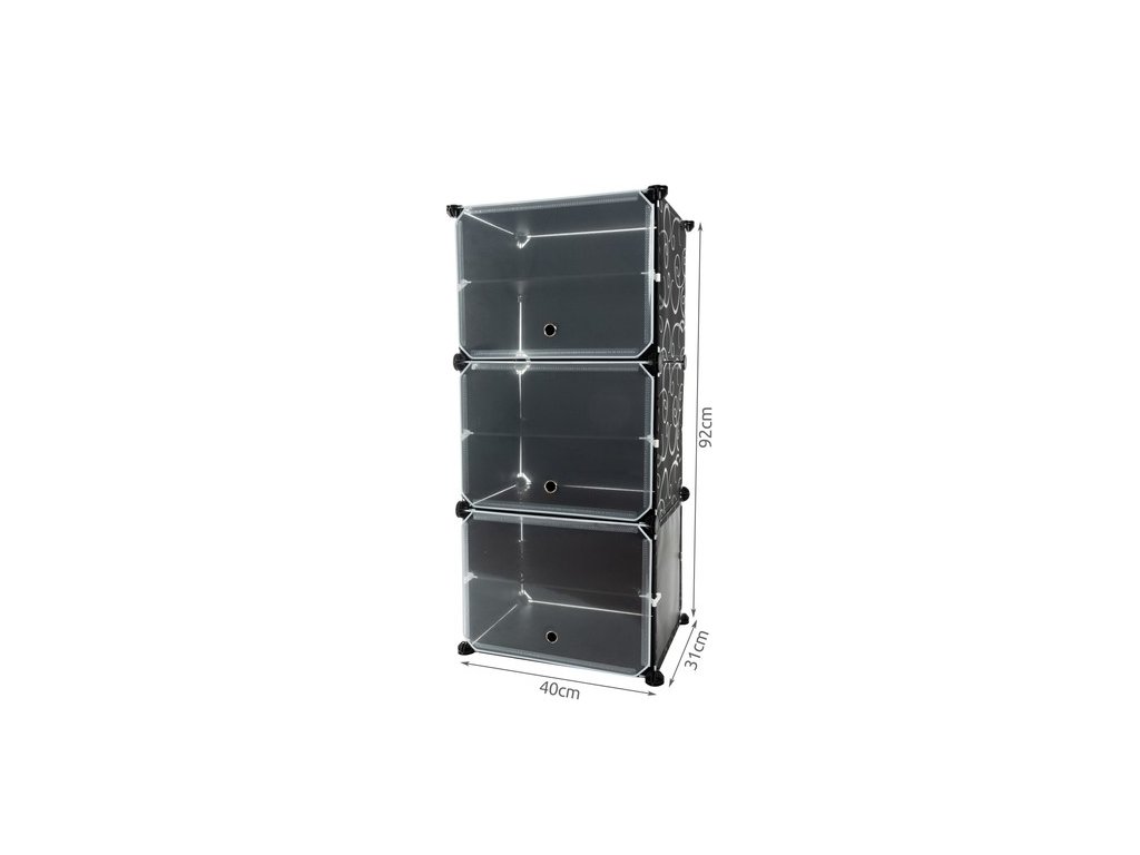 - ŠPECIFIKÁCIA - 3 moduly v cene; možnosť zloženia podľa vlastného konceptu: áno; materiál: plast; 6 políc: áno; otvárateľné dvere: áno; kovový rám: áno; rozmery (výška / šírka / hĺbka): 92/40 / 31cm; hmotnosť: 3,2 kg; hmotnosť v balení: 3,5 kg.