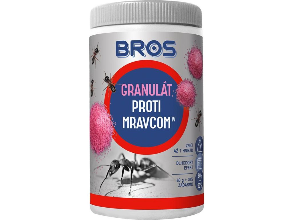 Granule Bros proti mravcom sú určené pre vnútorné priestory a tesné okolie domov: garáže, terasy, príjazdové cesty, záhradné chatky a pod. - Prášok dokáže zničiť až 10 hniezd. POUŽITIE: Prípravok sa aplikuje vo forme prášku alebo vo forme roztoku ráno a večer. Prášok sa rozsýpa vo forme tenkej vrstvy na miestach výskytu mravcov. Prášok bude do hniezda zanesený hmyzom a kolónia hmyzu bude zlikvidovaná. Vodným roztokom prášku sa polievajú miesta výskytu mravcov. 100g prášku rozpustiť v 2,5 litra vody, dôkladne premiešať a ihneď aplikovať.