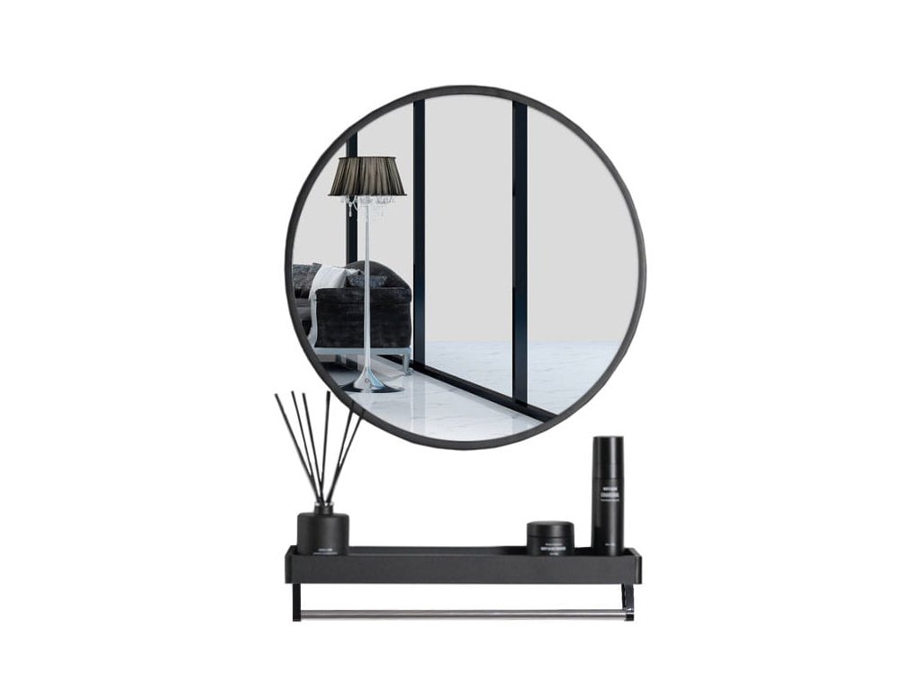 Okrúhle zrkadlo s policou 80cm čierne