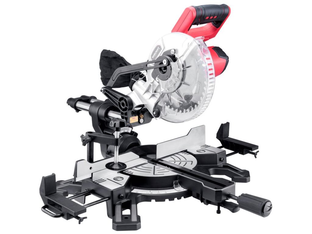- Píla je vybavená laserom na presné vedenie rezu (zvyšuje presnosť rezného uhla v porovnaní s ručne načrtnutými líniami rezu), odnímateľným vreckom na zbieranie prachu a postrannými podperami obrobku.