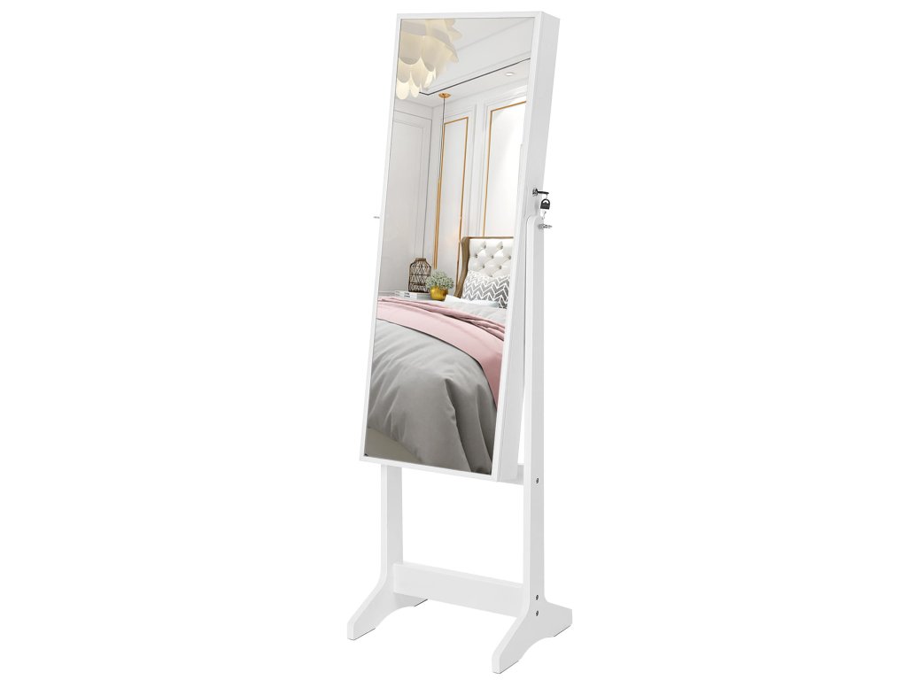 Skrinka NA STOJAN SO ZRKADLOM NA ŠPERKY, HODINKY, DOPLNKY, BIELASkrinka so zrkadlom na šperky, hodinky, okuliare a iné cenné predmety. Veľmi elegantná a praktická skrinka, ktorá zapadne do dekorácie vašej spálne, šatne či obývačky a zároveň bude perfektným darčekom pre každú ženu.