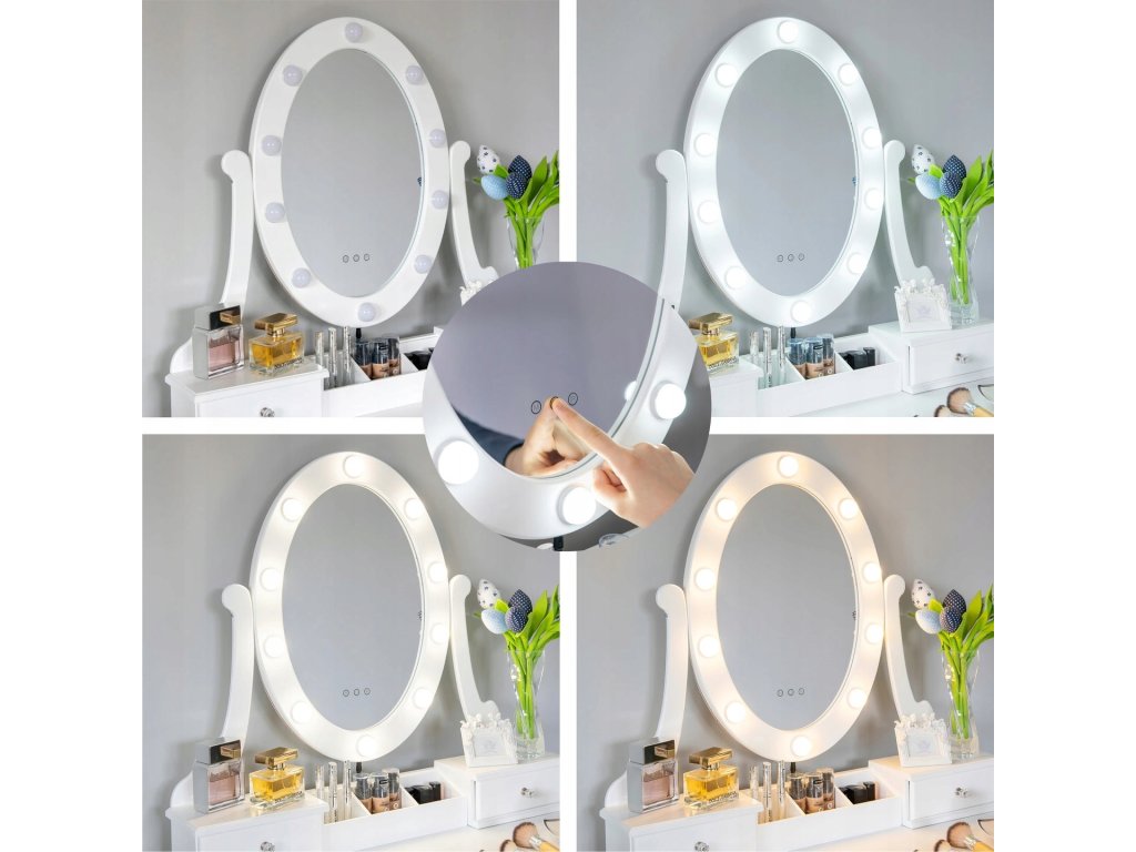 K dispozícii sú tri teploty farieb LED: 6000K biele prírodné svetlo podobné dennému svetlu dokonale osvetľuje pokožku, 4500K jasné, teplejšie svetlo podobné žiarivkám a teplé svetlo 3000K. Každá z farieb, z ktorých si môžete vybrať, môže byť navyše individuálne zosvetlená alebo zosvetlená, čo vám dáva úplnú kontrolu nad osvetlením a možnosť vytvoriť jedinečnú atmosféru v miestnosti, takže toaletný stolík sa dá použiť aj ako neobvyklá svetelná dekorácia.