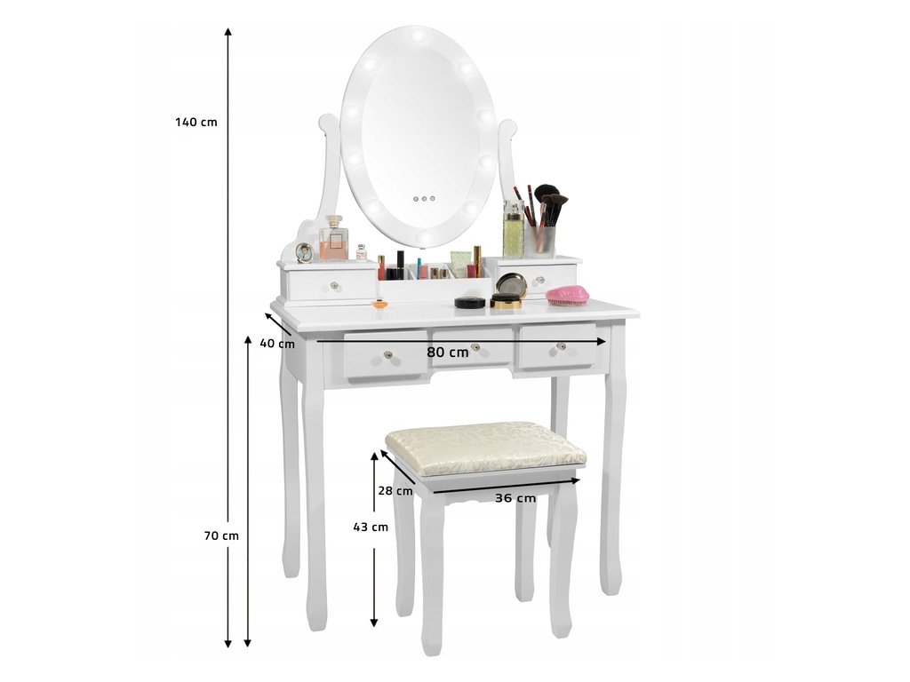 Unikátny dizajnový štýl, Osvetlenie zrkadla umožňujúce rovnomerný make-up, Možnosť zvoliť si jednu z 3 farebných teplôt pomocou dotykového tlačidla na zrkadle, Možnosť stlmiť alebo zosvetliť svetlo, Intuitívny spínač, senzor vo forme 3 dotykové tlačidlá zabudované do zrkadla, veľká horná časť, ktorá poskytuje veľké množstvo priestoru, päť zásuviek na odkladanie mnohých ženských doplnkov, sedadlo naplnené mäkkou penou pre maximálne pohodlie pri sedení, vyrobené z vysoko kvalitného dreva a MDF, ideálne do spálne, šatníka, obývacej izby Skvelý darček.